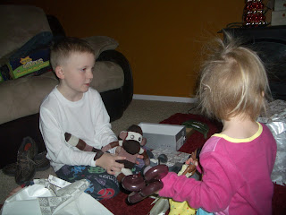 Well I said that this christmas I was going to do an all homemade christmas, I made itr about 90% of the way then me and my sewing machine had a messy break-up and it almost got thrown into oncoming traffic. The kids were excited though and loved their sock monkeys as did my niece Harper that I made one for. We also ended up making a kitchen out of an entertainment center for Tenley and I love how it turned out, the felt food that I made her is a different story cute but not holding up the best. I also have to show a christmas carnage picture because they are my favorite.